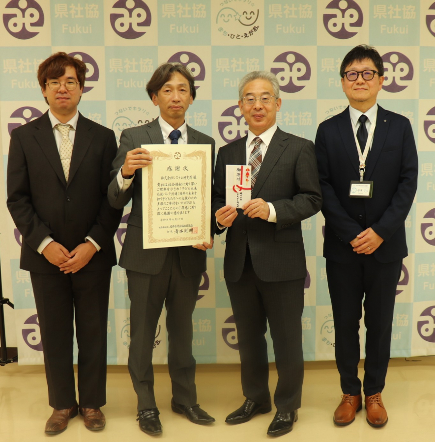 寄付金 20万円 令和8年4月17日 <寄付者> 株式会社システム研究所 様(福井市) <寄付先> 福井県社会福祉協議会「子ども未来応援バンク」 (子ども食堂の立ち上げ助成) このカテゴリのインデックスへ