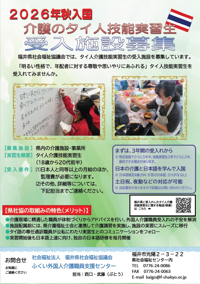 社会福祉法人福井県社会福祉協議会(以下「県社協」)では、介護人材が不足する厳しい状況の中、人材の確保に悩む県内介護施設において、外国人介護技能実習生(以下「実習生」)の受入が円滑に進むよう、 福井県との連携のもと、監理団体として当該実習生受入事業に取り組んでいます。